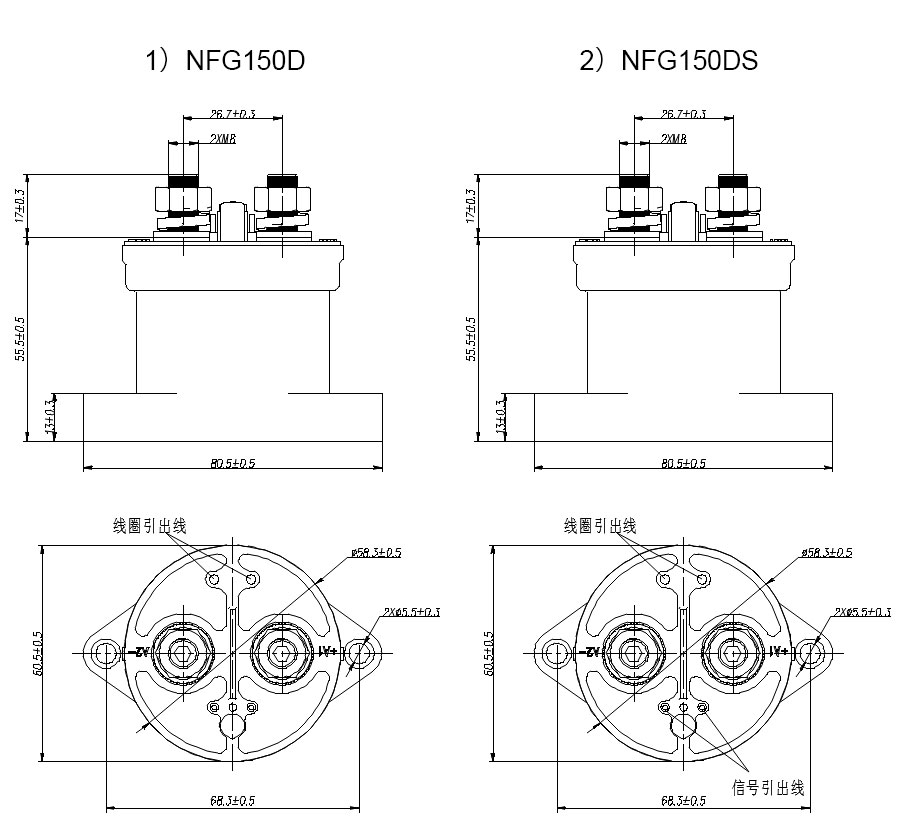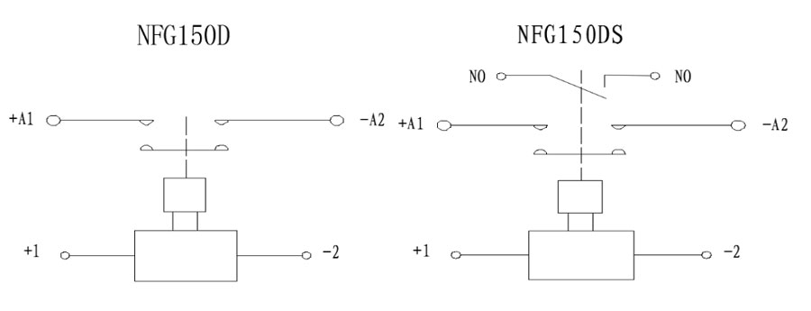 Ejemplo: NFG150DS indica que la corriente nominal de la carga del producto es 150 A (resistiva), la forma de contacto principal es una normalmente abierta (rosca externa) con un contacto auxiliar normalmente abierto, el voltaje de la bobina es CC 12 V y se utiliza el método de instalación inferior.