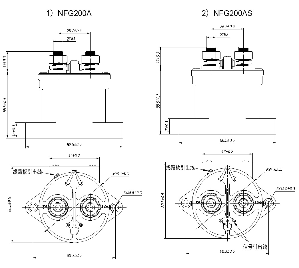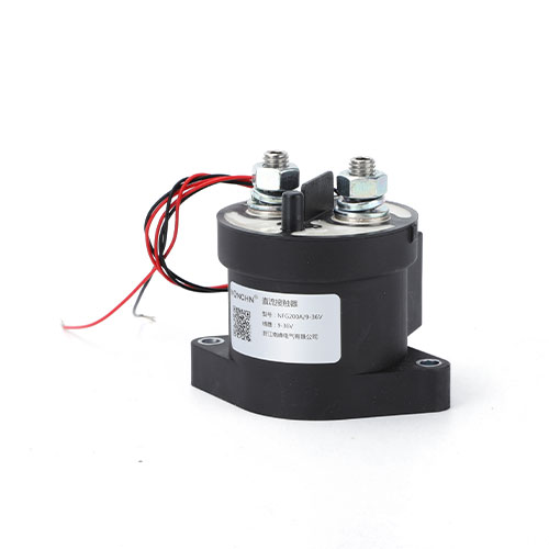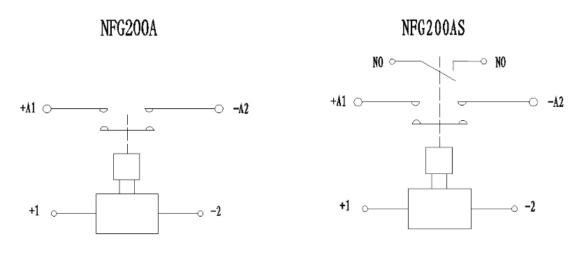 Ejemplo: NFG200AS indica que la corriente nominal de la carga del producto es de 200 A (resistiva), la forma de contacto principal es una abierta normal (rosca externa) con un contacto auxiliar abierto normal, el voltaje de la bobina es (9~36) V (CC) y se utiliza el método de montaje inferior.
