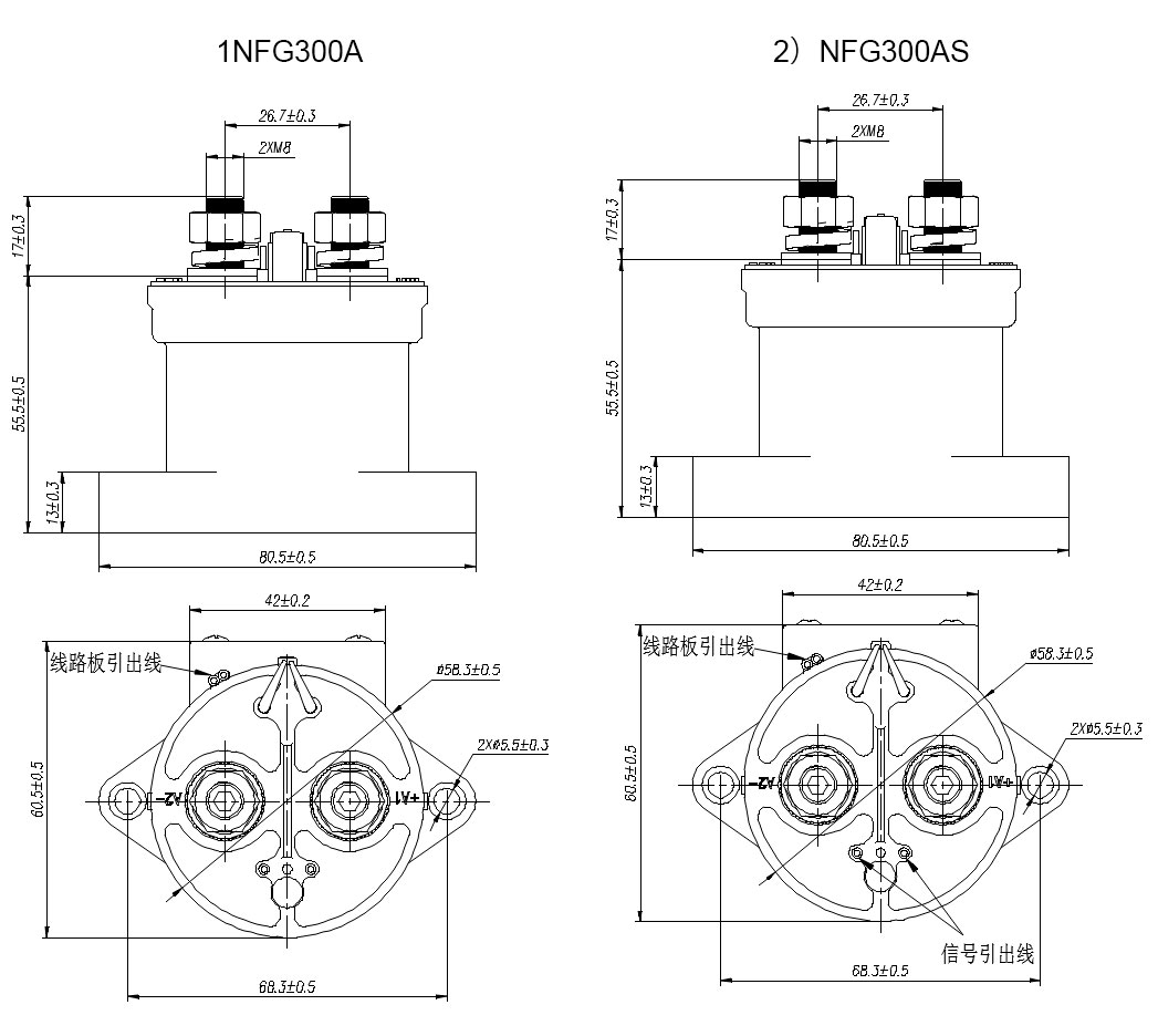 Ejemplo: NFG300AS indica que la corriente nominal de la carga del producto es 300 A (resistiva), la forma de contacto principal es una abierta normal (rosca externa) con un contacto auxiliar abierto normal, el voltaje de la bobina es (9-36) V (CC) y el método de instalación inferior.